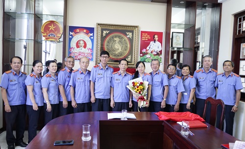 Ban Lãnh đạo Viện, lãnh đạo các phòng chụp hình lưu niệm cùng đồng chí Trần Hồng Diễm. Ảnh: Bình Tánh