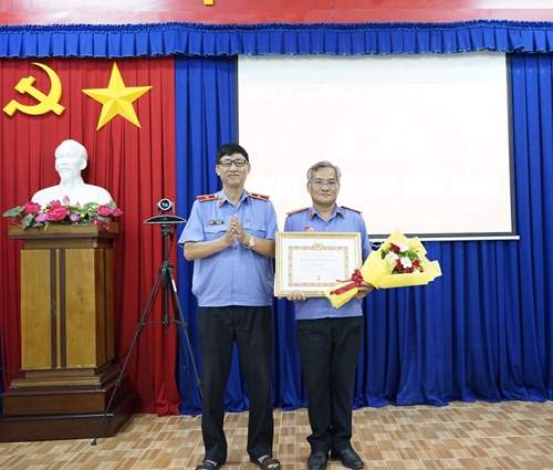 Đ/c Đinh Gia Hưng trao huy hiệu 30 năm tuổi Đảng và hoa cho Đảng viên Lê văn Ninh. Ảnh: Bình Tánh