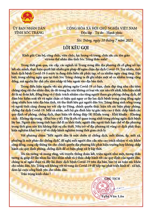 STO - Ngày 10-7, Chủ tịch UBND tỉnh Trần Văn Lâu đã ra Lời kêu gọi cán bộ, công chức, viên chức, lực lượng vũ trang, chức sắc các tôn giáo và toàn thể nhân dân tỉnh Sóc Trăng cùng đoàn kết, đồng lòng và ý thức trách nhiệm thực hiện các biện pháp phòng, chống dịch Covid-19, ngăn chặn sự lây lan dịch bệnh trong cộng đồng, bảo vệ sức khỏe của chính mình cũng như mọi người xung quanh. Báo Sóc Trăng xin trân trọng đăng toàn văn Lời kêu gọi của Chủ tịch UBND tỉnh Sóc Trăng.