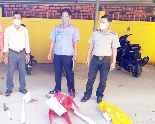 Vật chứng tiêu hủy lần này gồm: 01 cây dao dài 26cm, cán bằng nhựa dài 11cm, lưỡi bằng kim loại dài 15cm; 01 cây dao yếm dài 37,5cm và ngang 7,5cm có cán và lưỡi dao bằng kim loại màu đen; 01 cây dao tự chế bằng kim loại dài 58cm, rộng 4,2cm, lưỡi bằng kim loại dài 33cm; 01 cây dao tự chế bằng kim loại dài 60cm, rộng 06cm, cán dao bằng gỗ dài 28cm, lưỡi dao bằng kim loại dài 32cm; 01 cây phản bằng kim loại có chiều dài 78cm, rộng 5,5cm cán bằng gỗ 18cm; 01 cái ghế; 01 phần ly thủy tinh vỡ và 01 khúc gỗ màu đen dài 2,1m đây là số vật chứng trong các vụ án hình sự.