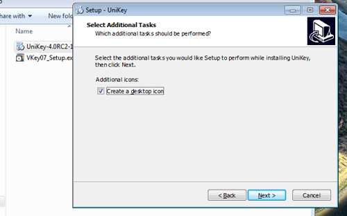 - Bước 6: Click chọn vào ô Create a desktop icon để hiện biểu tượng Unikey trên màn hình nền sau khi cài đặt xong, sau đó bấm Next