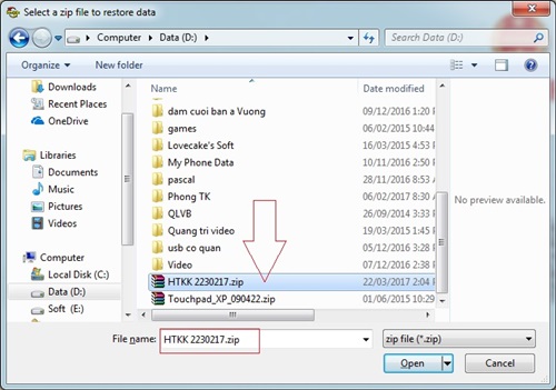 Chọn đúng dữ liệu người dùng đã sao lưu để đưa vào phần mềm HTKK.