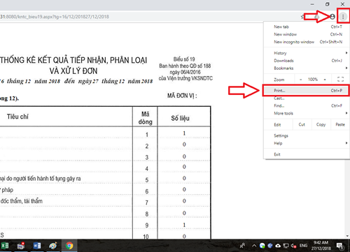 Sau khi thực hiện thao tác Thống kê theo biểu 19 hoặc biểu 20 trên phần mềm quản lý đơn khiếu nại tố cáo có kết quả. Ta thực hiện thao tác in như sau: