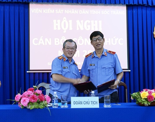Đ/c Đinh Gia Hưng, Viện trưởng và đ/c Huỳnh Thế Đức, Phó Viện trưởng, Chủ tịch Công đoàn cơ quan ký kết Quy chế phối hợp và Bản giao ước thi đua năm 2019