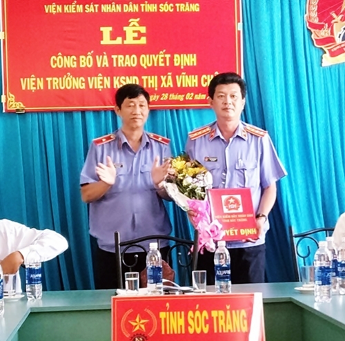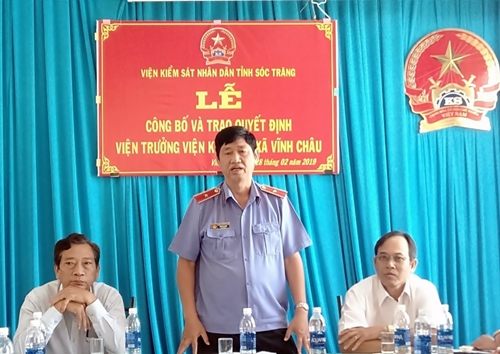 Tại buổi lễ đồng chí Trầm Thiện Minh - Trưởng phòng tổ chức cán bộ Viện KSND tỉnh Sóc Trăng đã triển khai và công bố Quyết định của Viện trưởng Viện KSND tỉnh Sóc Trăng về việc điều động đồng chí Lâm Thăng Bằng – Viện trưởng Viện KSND huyện Long Phú đến nhận nhiệm vụ Viện trưởng Viện KSND thị xã Vĩnh Châu kể từ ngày 01/03/2019. Đồng thời Thông báo Quyết định số 08/QĐ-VKS ngày 26/02/2019 của Viện trưởng Viện KSND tỉnh Sóc Trăng về việc điều động đồng chí Đỗ Văn Tài, Viện trưởng Viện KSND thị xã Vĩnh Châu nhận nhiệm vụ mới.