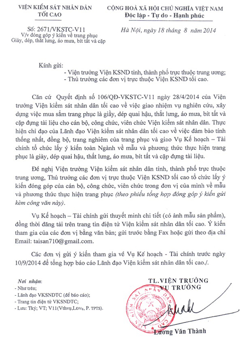 Ngày 18/8/2014, M 789Win2 im link mới nhất tối cao ban hành Công văn số 2671/VKSTC-V11 về việc đóng góp ý kiến về trang phục giày, dép, thắt lưng, áo mưa, bít tất và cặp. Trang tin điện tử M 789Win2 im link mới nhất tối cao đăng toàn văn công văn trên và các văn bản liên quan để các đơn vị trong Ngành tham khảo:
