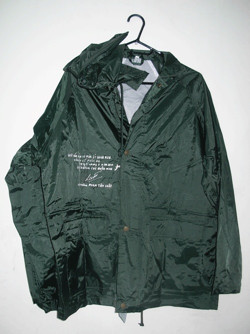 Áo: kiểu mở ngực có khóa fecmơtuya cài suốt, hai bên nẹp có đáp nẹp được tán cúc đồng. Ngang eo bên trong may đáp để luồn dây điều chỉnh, áo có phần mũ rời cài bằng nút bấm đồng, miệng mũ có dây rút miệng. Thân trước có túi may ốp ngoài, túi có nắp dán dính, thân sau có đề cúp, lót đề cúp bằng vải lưới, súp cửa tay may chun.