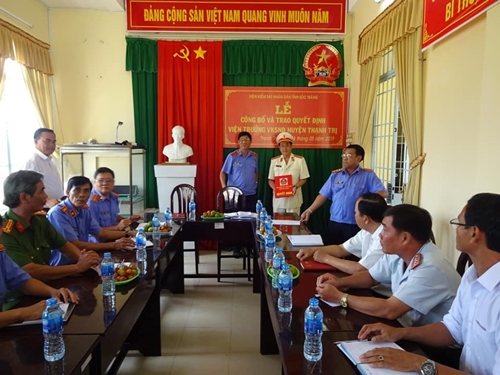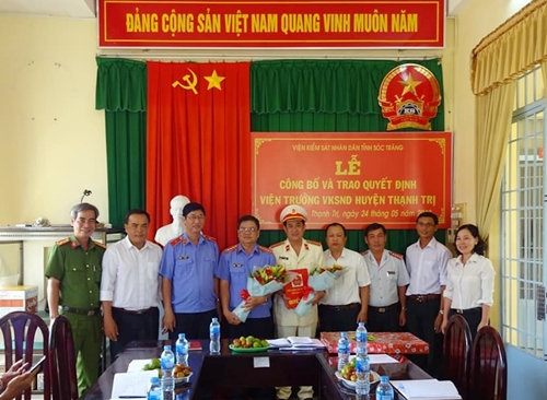 Đồng chí Đinh Gia Hưng - Viện trưởng Viện KSND tỉnh Sóc Trăng trao quyết định điều động, bổ nhiệm chức vụ Viện trưởng Viện KSND huyện Thạnh Trị đồng chí Lý Chân