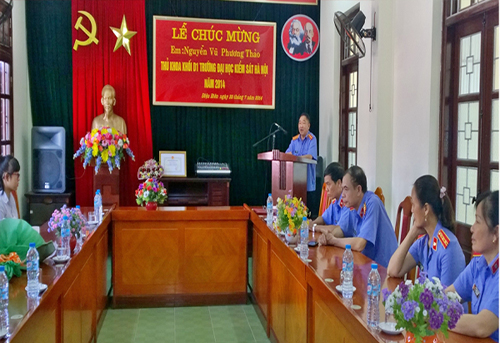 | Năm 2014, toàn tỉnh Điện Biên có 142 thí sinh nộp hồ sơ đăng ký dự thi vào trường Đại học Kiểm sát Hà Nội. Kết quả kỳ thi tuyển sinh Đại học năm 2014, cháu Nguyễn Vũ Phương Thảo đạt tổng số điểm 03 môn thi là 24 điểm, với số điểm trên, cháu Thảo đã đỗ Thủ khoa khối D1, trường Đại học Kiểm sát Hà nội năm 2014. |